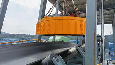电磁除铁器的工作原理,是将金属材料通过输送机送入除铁器内部,在除铁器内部,电磁铁产生高频振荡电磁场,金属材料在通过这个磁场的同时,瞬间被磁化,从而产生与磁场方向相反的磁场,这样,磁性颗粒之间的磁力相互作用会产生磁场,从而使这些颗粒受到同性排斥力,因此从输送机上铁分离出来。